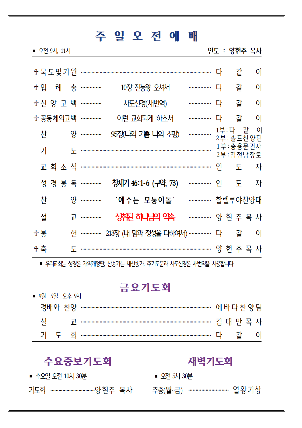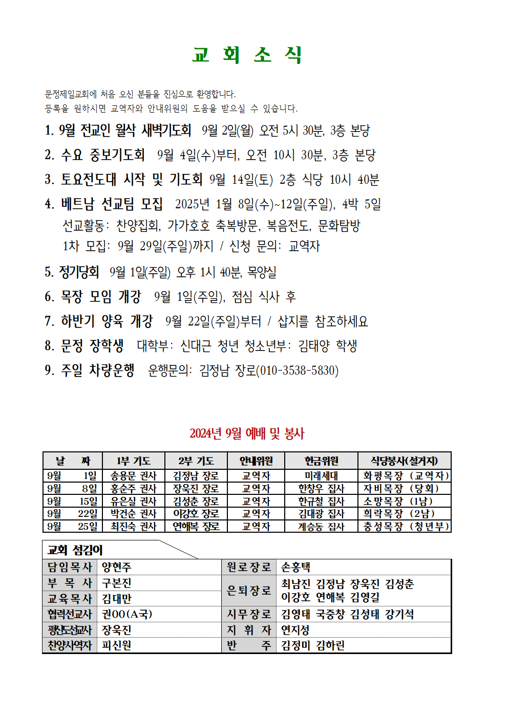 | 이전글 | 2024년 9월 8일(둘째주) 주보 | 구본진 | 2024.09.07 | 0 | 177 |
