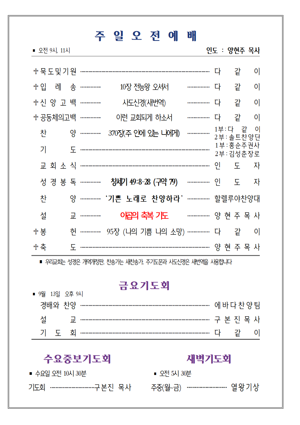 | 이전글 | 2024년 9월 15일(셋째주) 주보 | 구본진 | 2024.09.14 | 0 | 190 |
